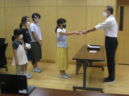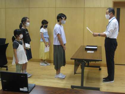 今日は、「第71回 社会を明るくする運動 作文コンテスト」優秀賞2名と、昨日のお昼の校内テレビ放送で発表した2名(「第17回 富山市小中学校 科学展覧会」 金賞1名と銀賞1名)の授賞式でした。