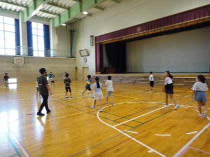 今日ののびのびタイムは体育館が使えたので、ドッジボールを行いました。ボールを投げる、キャッチする、避けるなどの動作を、遊びながら身に付けています。まだまだ片手で投げることができない児童がいるので、声を掛けることで、遊びの中でも投げる動作を身に付けていくことができればよいと考えています。