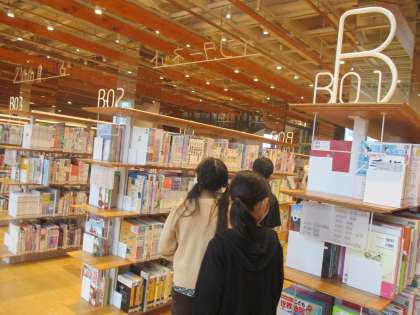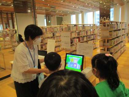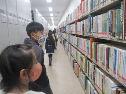 富山市立図書館での校外学習の様子です。普段入れない書庫に入らせていただいたり、貸出システムについて話を聞いたりすることを通して、図書館の役割や利用方法について学ぶことができました。
