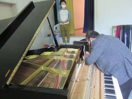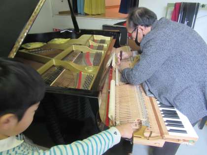 そこで、今日はピアノの調律師さんが来校され、長時間にわたって体育館にあるグランドピアノが最高の状態になるようにとみてくださいました。
