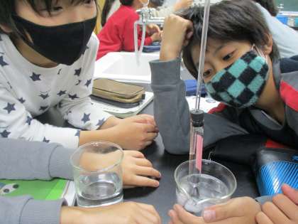 理科の「ものの体積と温度」という学習では、理科室で学習を進めています。空気や水の体積が温度によって変化することを実験しました。「うわあ、すごい!」「こんなに変わるんだ!」などの声がたくさんあがっていました。実験大好きな4年1組の子供たちです。