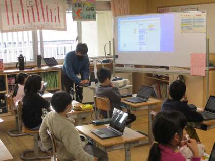 今日の学活では、プログラミング学習として「Scratch」を使ってみました。プログラミングに楽しく触れ、慣れてほしいと思い、特別講師の先生(という名の、前担任)をお招きして授業をしました。子供たちは、最初は戸惑っていたものの、すぐに使い方を覚え、キャラクターの動きにアレンジを加えたり、音を出したりできるようになりました。今日の学習をきっかけにプログラミングに興味をもつとともに、物事を順序立てて考えることができたらと思います。