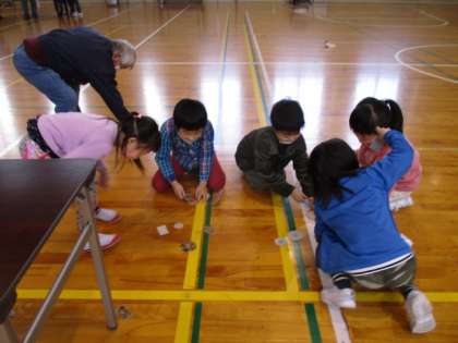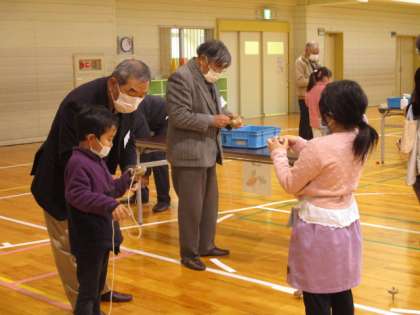 メンコは初めて経験する子がほとんどで、ひっくり返すのが難しいようでした。コマはひもをうまくのに苦労していました。老人クラブの方がとても上手にまわされるのを見て、驚いていました。