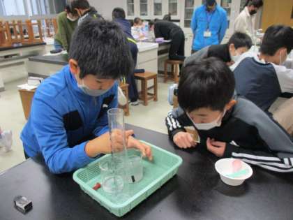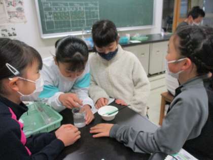 今日は、水の量を増やしたらとけるものの量がどのように変化するか調べました。50mLの水にスプーン4杯とけた前回の実験を基に、水の量が100mL、150mLと、2倍3倍に増えたら、とける食塩の量も2倍3倍になると予想した子供達が多かったです。グループで、水や食塩を正確に測る人、一生懸命混ぜる人等、協力して実験に取り組みました。