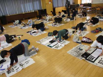 今日の書写では、書初の練習をしました。毛筆での書初は初めてなので、まずは道具の並べ方や書くときの姿勢を学習しました。実際に書いてみると「難しいなあ」「上手に書けない・・・」とつぶやく子供たち。これまでのように半紙に書くのとは違い、大きな紙に書くのはとても難しい様子でした。これから、字の大きさやバランスに気を付けながら、上手に書けるように練習をしていきます。