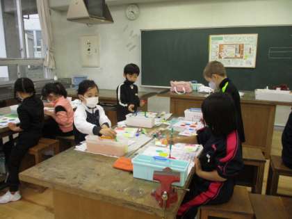 初めての水彩絵の具の学習をしました。道具の名前や置き方を覚え、使い方に慣れていきます。この日は、ツリーの飾りを5つの色で塗りました。クレヨンで木を塗ったり、折り紙で星等を付けたりして完成し、教室に飾る予定です。