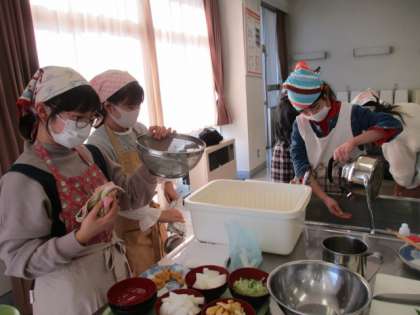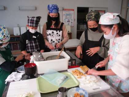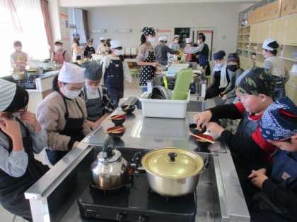 今日は家庭科の学習でみそ汁を作りました。煮干のだしに、実は大根、油揚げ、ねぎです。水の分量や火にかけるタイミング等に気を付けてました。おいしいみそ汁を作ろうと、グループのみんなで協力しました。どのグループも大成功。一滴も残さず食べました。