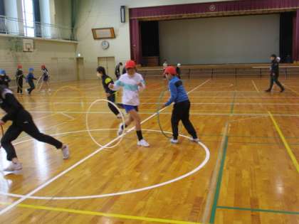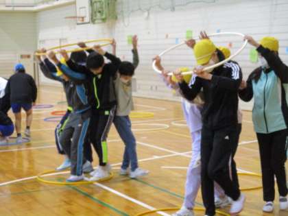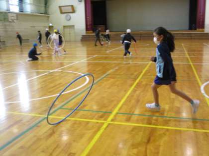 体育科では、ボールやフラフープを使って体の動きを高める運動に取り組みました。フラフープを転がして、回っている間にその周りを回ったり、チームでフラフープの中に入って息を合わせて移動したりするなど、いろいろな運動に挑戦。タイミングを図って動くのは難しそうでしたが、何回も練習してできるようになりました。