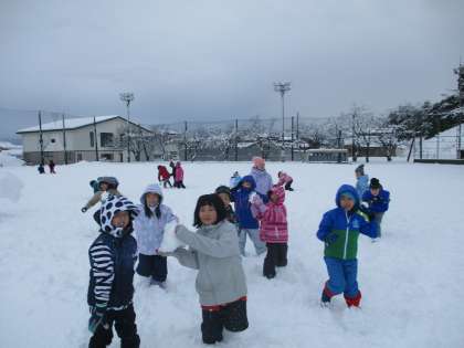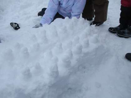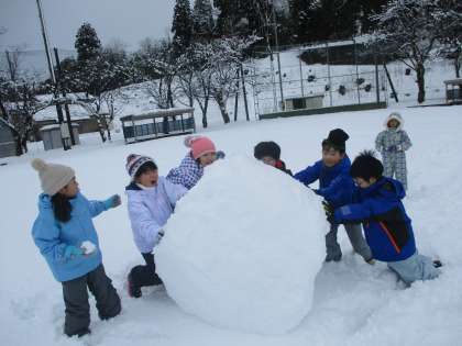 今日は、雪遊びをしました。グラウンドにはどっさり雪が降り積もっており、3年生は全校の中で一番乗りで遊ぶことができました。まずはグラウンドを開拓するために雪の中をみんなで歩きました。その後、一人一人が好きな遊びをしました。自分の身長ほどもあろうか大きな雪玉をみんなで転がしたり、鬼ごっこをして、走っている最中に雪の中に飛び込んだりしました。他にも、雪でかわいいアヒルを全員分(32名の子供たち+担任分)作っている子もいました。雪を存分に楽しんだ子供たちでした。