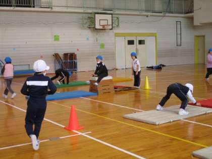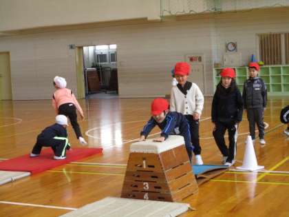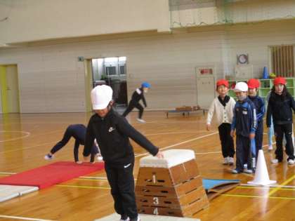 跳び箱の学習を行っています。楽しく飛び越すことができるように、かえる跳びやロイター板を使ってのジャンプに何度も取り組み、どの子も上手になってきました。
