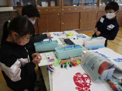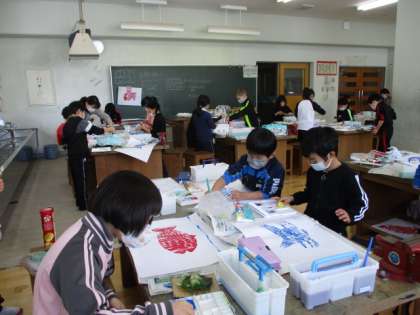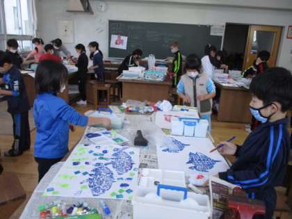 図工の学習で粘土版画を行っています。今日は、粘土版画で刷った海の生き物の周りの様子をいろいろな物でスタンピングして彩りました。楽しい海の世界をつくりあげていました。