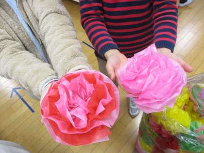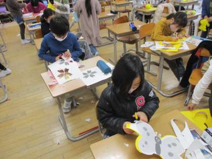 6年生の卒業をお祝いするために、掲示物の準備を始めました。今日は、花紙で花を作ったり、画用紙を桜やちょうちょの形に切り抜いたりしました。自分の作りたい作品を選んで丁寧に作ることができました。