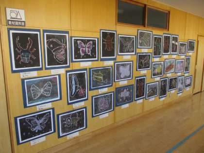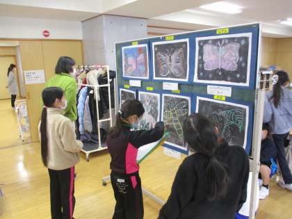 できあがった版画作品を見合いました。どの作品もよさが見られます。鑑賞カードには、「ちょうちょの様子がよく捉えられていた」「色使いがきれい」と、友達の作品のよさを書き留めました。