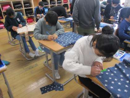 家庭科では、ミシンを使ってエコバッグ作りに挑戦しています。家庭で活用できるものなので、縫い目をそろえよう、返し縫いをしっかりして丈夫に仕上げようなど、真剣に取り組んでいます。できあがりが楽しみです。