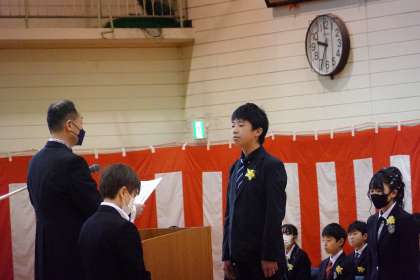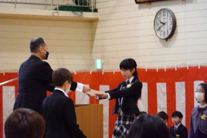 その後、卒業証書を持ちながら、「成長を支えてくださった家族や地域に感謝をし、この先の中学校生活に希望をもち努力していこう」という誓いを心にもてる校長先生の式辞、PTA会長のNさんの祝辞をいただきました。