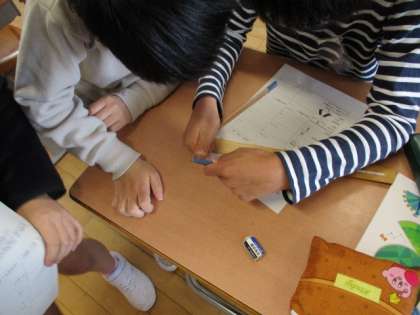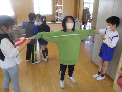 4年生に進級し、初めての授業です。今日の授業は「体の部位の長さ調べ」。あた、つか、歩幅等知っておくと便利な長さを測りました。グループで楽しく活動する中にも、単位を変換したり、10倍、10分の1いった数量の関係を使ったりして、これまでの復習も兼ねた学習になりました。また、両手を広げた長さが身長とほぼ同じ長さになることにも気付き、新たな発見があった子供たちでした。