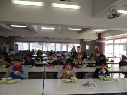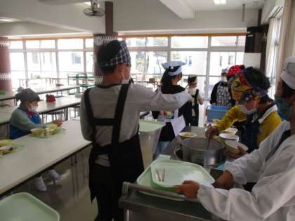 5年生になり、給食の準備が速くなりました。子供たちのみで配膳をしています。