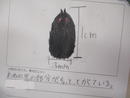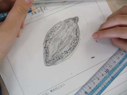 ヘチマの種を観察しました。色や形、大きさに注目したり、これまで見たことのある種と比べたりして丁寧に記録しました。