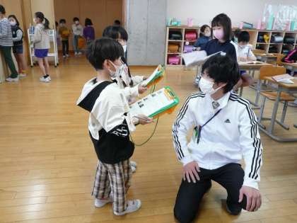 先生の名前を覚えた子供たち。もう一度学校を探検しました。教室に入るときには、丁寧な言葉で「〇〇先生、少し教室を探検してもいいですか」と話しかけることができました。探検で見つけた物をクラスではきはきとした声で発表しました。