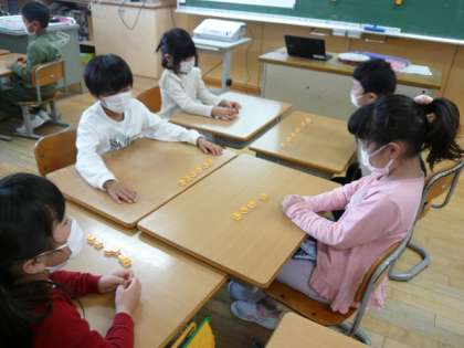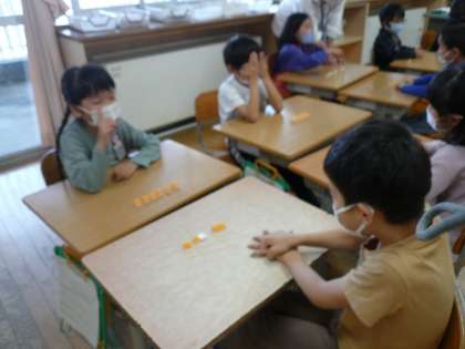 ブロックを使って、数の構成をとらえる学習をしています。ペアでブロックを見せ合いながら、「6は4といくつ?」のようなクイズを出し合いました。子供たちは、友達がつくるクイズを楽しそうに答えていました。