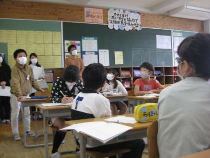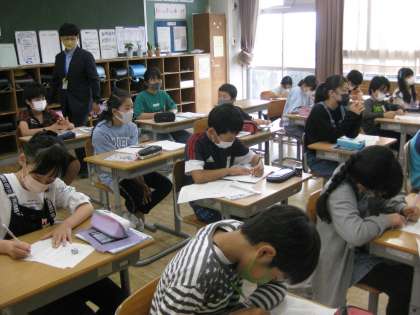 昨年、4年のときは、1クラスみんなで授業をがんばってきました。今年度、5年になり、2クラスでがんばっています。国語、算数等、各クラスで学ぶ時間もあれば、音楽・体育等2クラス合同で昨年度の仲間で学んでいる時間もあります。