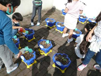 毎朝あさがおの水やりを頑張っている1年生。アサガオの小さな芽が出始めています。「3つも芽がでて嬉しいな」「小さくてかわいいな」と喜びを表す子供たち。まだ芽が出ていなくて残念がっている友達に「水をたくさんあげたらいいよ」「お日様がたくさん当たるところに鉢を動かしたらいいよ」など、優しくアドバイスする姿が見られました。