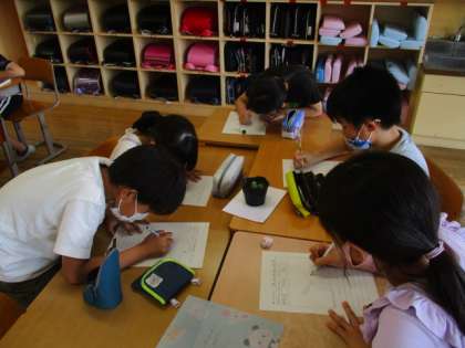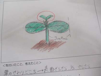 ヘチマの種を蒔いてから約1か月が経ちました。あたたかな気候と子供たちの水やりのおかげで、たくさんの種から芽が出ました。観察のときは、色や形、手触りや大きさをよく見てカードに記録していました。