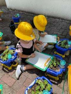 毎日お世話を頑張っている1年生。かわいい双葉が出始めています。「ハートみたいな形の葉っぱだね」「もっと大きくなってほしいな」など、友達と話しながらあさがおの観察をしていました。
