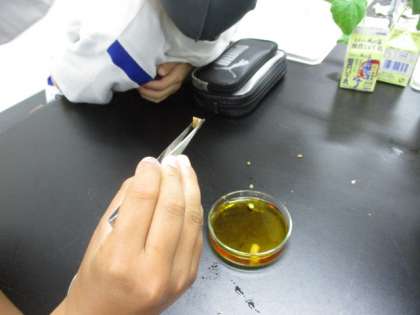 今日の理科の学習では、種子が発芽するときの子葉の働きについて調べるため、インゲンマメの種子と発芽してしばらく経った子葉をヨウ素水溶液に浸け、違いを観察しました。
