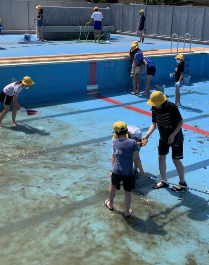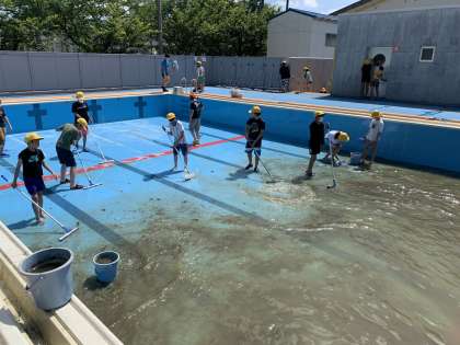 プール清掃を行いました。ピカピカになったプールを見て、今日の天気のように、晴れやかな気持ちになりました。