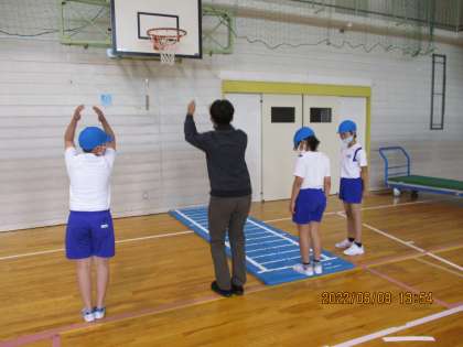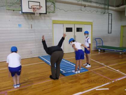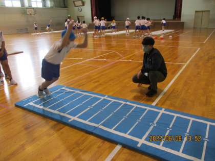 体力テストを行っています。立ち幅跳びの記録に挑戦しました。コツを掴んだ児童は、20cmも記録を伸ばしていました。