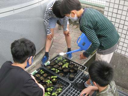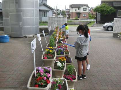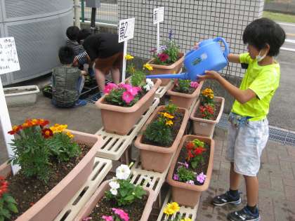 自分のあさがお、スマイル班で育て始めた花に、登校した子供たちが様子を観察したり、水やりをしたりしています。