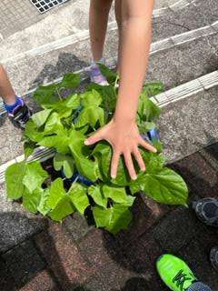 毎日のお世話のおかげで、あさがおは青々と元気に育っています。「前より葉っぱが増えたよ」「手のひらより大きくなってうれしいな」とあさがおの成長を喜んでいます。
