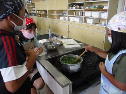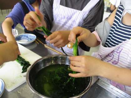 1組の子供たちが、ほうれん草のおひたしを作っているところです。