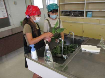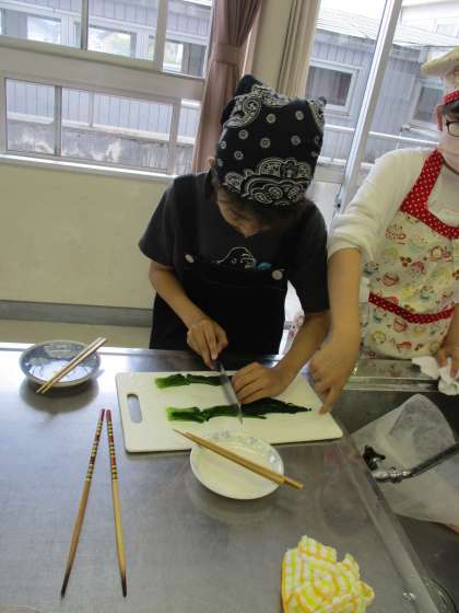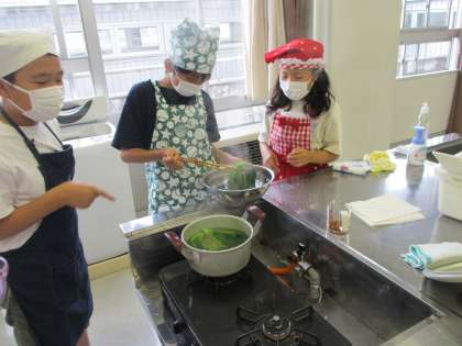 2組の子供たちが、ほうれん草のおひたしを作っている様子です。