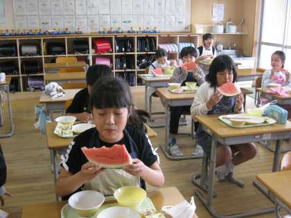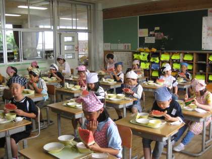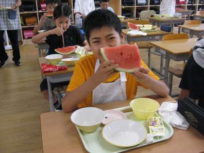 給食で、子供たちの顔より大きなスイカが出ました。みんな大喜びでした。