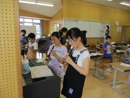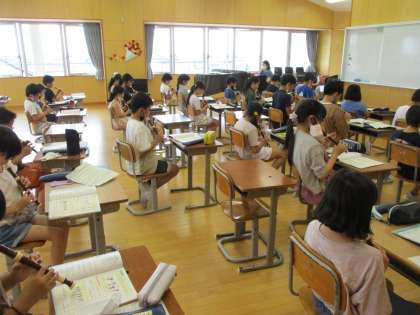 今日の音楽科の学習では、グループに分かれてリコーダーで演奏をしたり、発表したりしていました。楽しく、元気に活動しています。