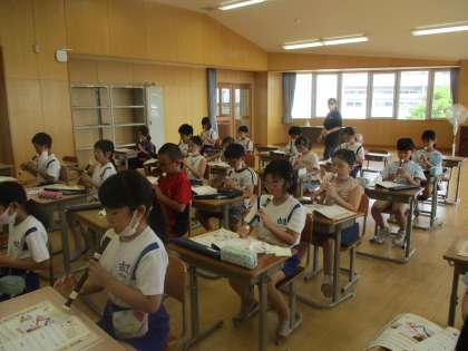 音楽では、リコーダーでソ、ラ、シ、ド、レがだんだん上手に吹けるようになってきました。指使いやタンギングに苦戦しながら練習をがんばっています。