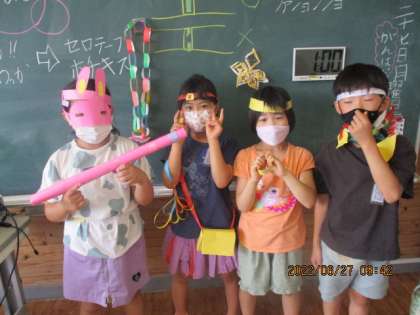 図画工作科で「わっかでへんしん」に取り組みました。画用紙をいろいろな形に切って輪を作ったり、紙テープをつなげたりしたものを身に付けました。勇者、王子様、妖精等、工夫を凝らして、いろいろなものに変身しました。