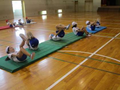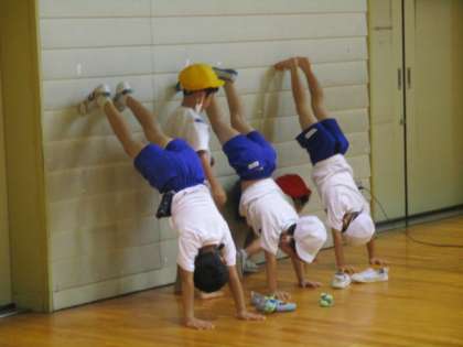 「ゆりかご」や「かえるの足うち」等、いろいろな技に挑戦しました。ブリッジのトンネルをくぐる運動は、体をどのように動かせばよいか、工夫して試していました。