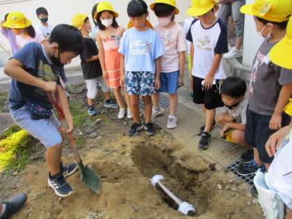 今年度、親子活動として学年委員の方々が、タイムカプセルを提案してくださいました。6年生の自分へのメッセージ、保護者からのメッセージ、親子で作ったプラバンを入れて、学校の中庭に埋めました。