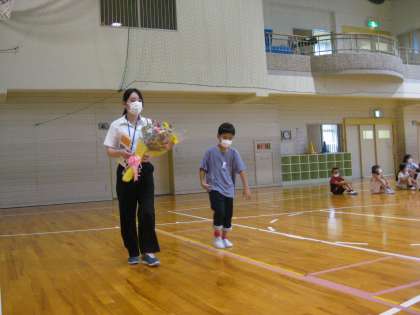 今日は、保健委員会の委員長がお別れのことばを述べ、特別支援級の子供たちが、手作りのプレゼントと花束を渡しました。
