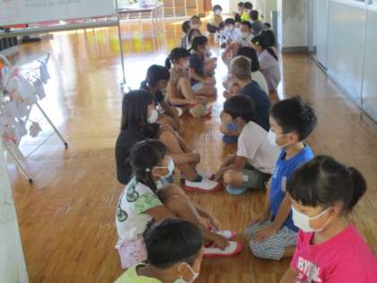始業式のために体育館に向かう前、時間を意識して整列していました。隣同士で、夏休みに心に残ったことを伝え合いました。