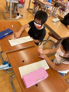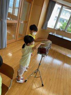 音楽科の学習で、いろいろな楽器や身の回りから聞こえる音を探す学習をしました。「手のひらを叩いたら「ぱん!」や「とん」と聞こえるよ」「ボンゴを強く叩くときと弱く叩き時では音が違うな」など、身の回りの音を楽しみました。自分が見付けた音でのクイズもペアで楽しみました。