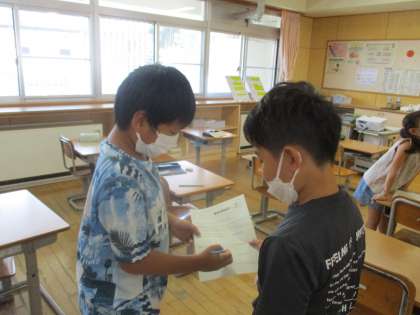 2学期初日は、「夏休みビンゴ」をして友達に夏の思い出を話しました。たくさんの友達にインタビューをして笑顔が広がりました。