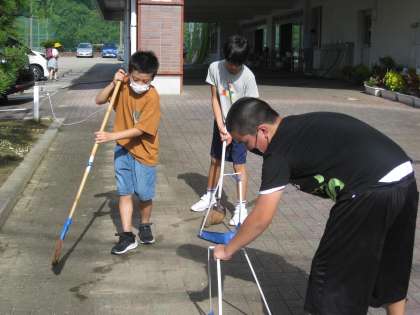 6年生たちが、プランターの花たちが風で飛ばされないように移動させてくれました。最後は、プランターの置かれていた下のタイルにたまっていた土や花がら等をほうきできれいにはいていました。