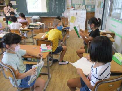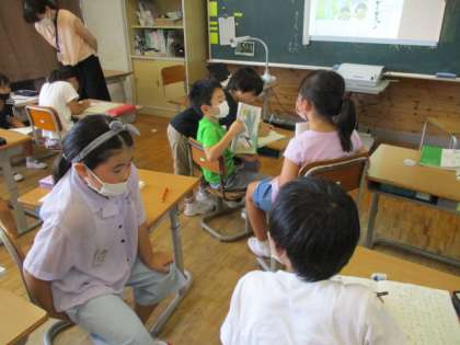 国語では、待ち合わせの場所を相手に言葉で伝える学習に取り組みました。教科書にある地図を見ながら、伝える人が待ち合わせ場所を決め、相手に伝えます。聞く人は、地図を見ないで、メモを取りながら聞き、その後地図で確かめました。
