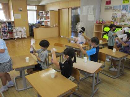 一学期から頑張って育てたあさがおで色水をつくりました。青色や紫色などきれいな色水ができて子供たちは大喜びでした。