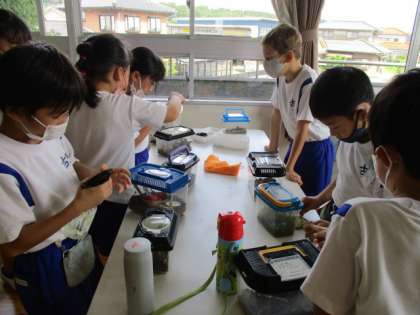 学校に持ち帰った虫たちが、安心して暮らせるように虫かごの環境を整えました。畑に実ったナスやピーマンを切って入れました。