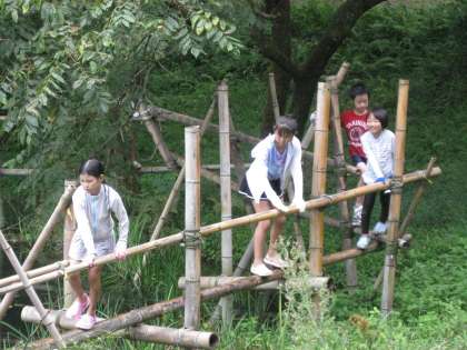 池ジャングルに挑戦です。ゆっくり慎重に・・・と思いきや、ドボン!となる子も。池に落ちても(落ちたときの方が!?)笑顔です。